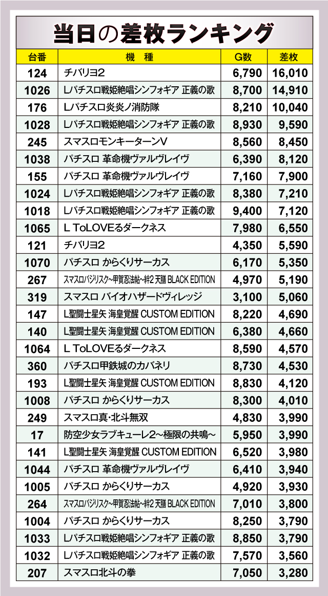 そして差枚ランキング上位マシンは、今後も好結果を残すことは必至。次回の実施に向け様々な情報を集めつつ、定期的に足を運ぶことをオススメしておこう。