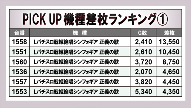 当日、特に盛り上がっていたのが上表の6機種だ。『Lパチスロ戦姫絶唱シンフォギア 正義の歌』『スマスロ北斗の拳』といった大人気機種を筆頭にスマスロの活躍が目立つばかりか、『沖ドキ!BLACK』や『ゴーゴージャグラー3』といったメダル機も好成績をマークしており、各所で打ちごたえのある状況が整っていたことが窺える。