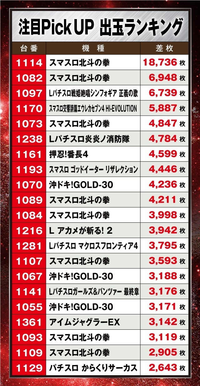 店内の様子をチェックしてみると様々な機種で好調な台を確認。特に『スマスロ北斗の拳』が活況で出玉ランキング1位の+18,736枚を筆頭に+6,000枚超が1台、+4,000枚超が2台、+3,000枚超が3台という見事な結果を残している。