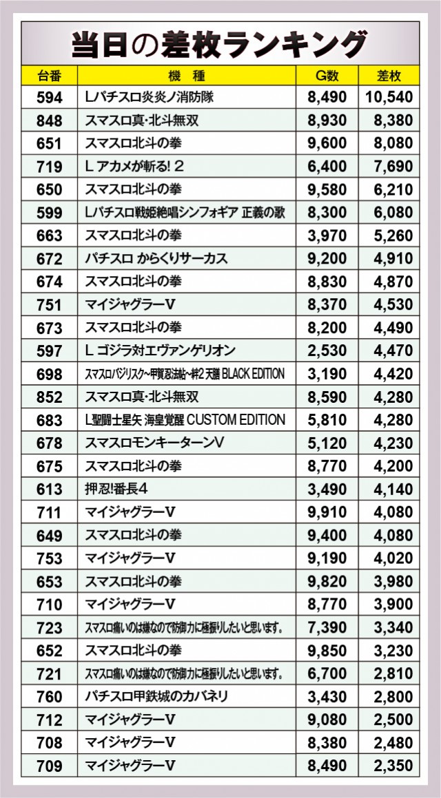 上表をご覧の通り、『Lパチスロ炎炎ノ消防隊』から発生した万枚OVERを筆頭に、『スマスロ真・北斗無双』『スマスロ北斗の拳』から8,000枚OVERが見られるなどの盛り上がりを披露した同店。大台突破台の存在が際立つが、消化されたゲーム数も8~9,000回転OVERが目立っており、遊技していたファンは手応えを感じていたはずだ。有意義な時間を過ごせたのは間違いなく、同店の気概が見てとれる内容と言える。