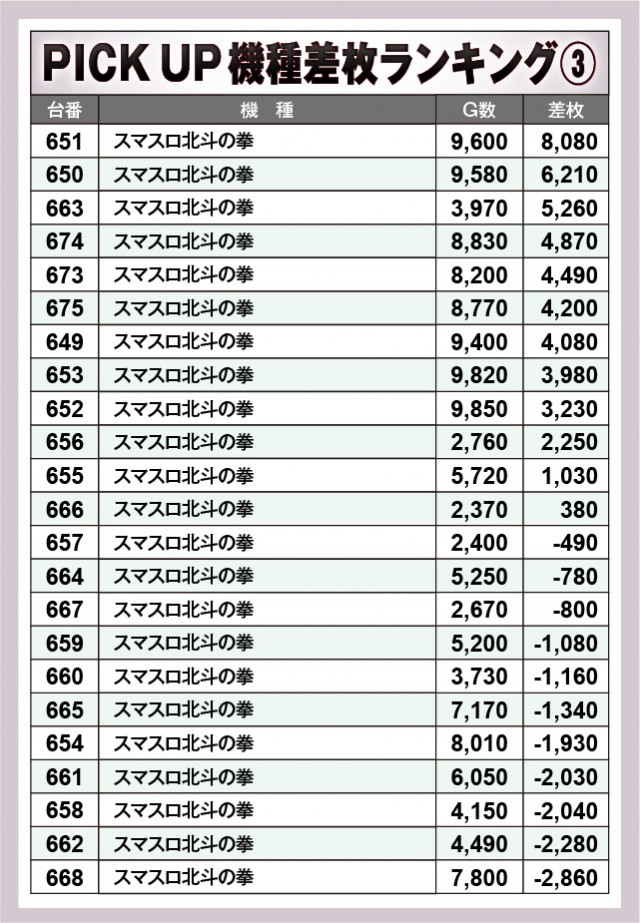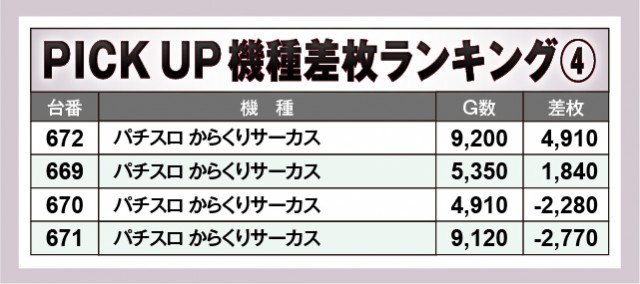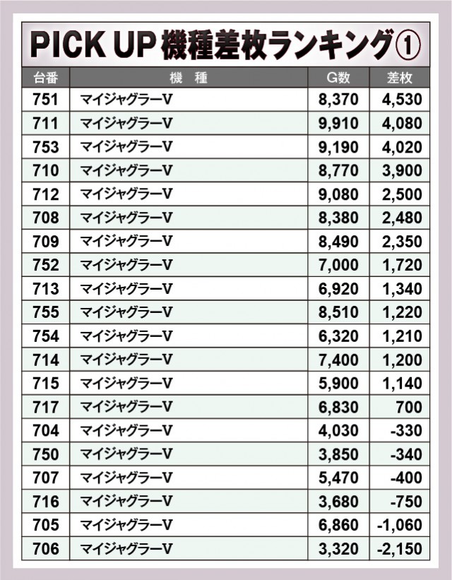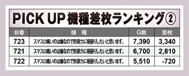 設置台数が多い『マイジャグラーⅤ』『スマスロ北斗の拳』は、その半数以上がプラス差枚を記録している。ファンがしっかりとレバーを叩いていた様子も窺えるばかりで、満足度の高いエリアになったことだろう。また『スマスロ痛いのは嫌なので防御力に極振りしたいと思います。』『パチスロ からくりサーカス』も奮起しており、これら機種が盛り上がりをリードしていたと言える。