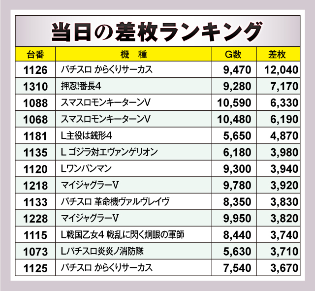 差枚ランキングを見てみると、13台すべてが+3,000枚オーバーで、+5,000枚オーバーは4台出現。それらのなかでもっとも優秀だったのは、1126番台の「パチスロ からくりサーカス」で、差枚は大台突破の+12,040枚を獲得! また、ランクイン機種を見渡すと、名だたるスマスロに負けじと「マイジャグラーⅤ」が2台ランクイン! スマスロ以外の機種にもキッチリとチャンスが隠されていたようだ!