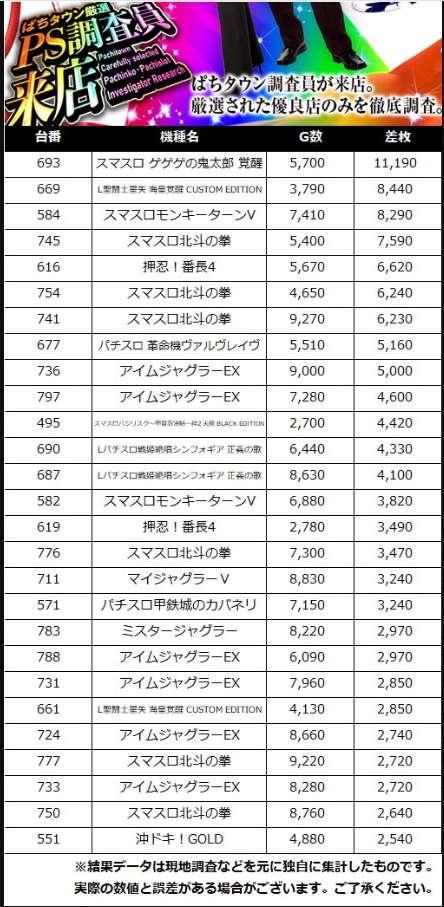 693『スマスロ ゲゲゲの鬼太郎 覚醒』:11,190枚669『パチスロ聖闘士星矢 海皇覚醒』:8,440枚584『スマスロモンキーターンV』:8,290枚
