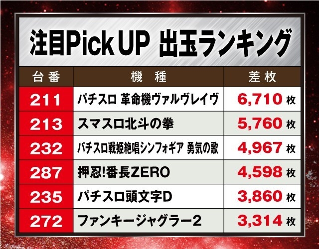 この日は前回の開催時同様、機種を問わずいたる所で+3,000枚超が発生、なかでも『パチスロ 革命機ヴァルヴレイヴ』で+6,710枚、『スマスロ北斗の拳』で+5,760枚と定番人気のスマスロが盛り上がりを見せていた。