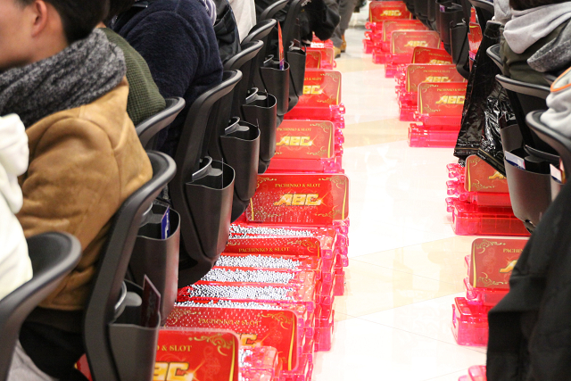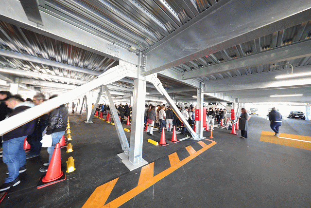 12時オープンを前に、駐車場は満車。立体駐車場にも地元のパチンコ・パチスロファンが怒涛の如く押し寄せ、開店を今か今かと待ちわびる。