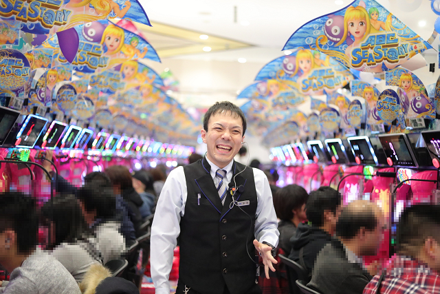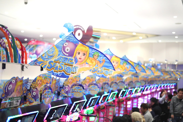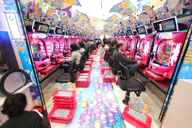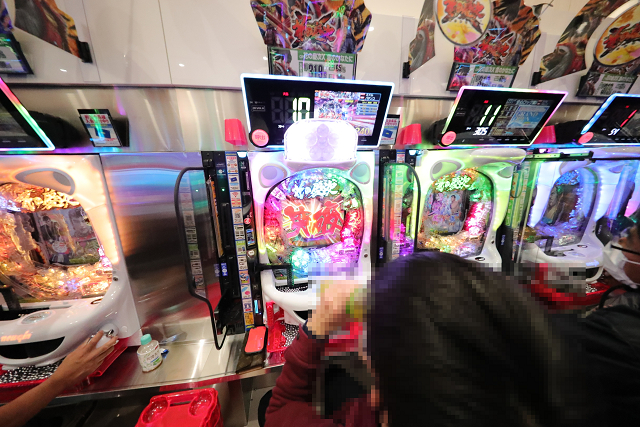 『海物語』コーナーは、右の台でも左の台でもマリンちゃんが天使の微笑み、『北斗無双』のコーナーでもジードの皆さんが今日もヒャッハー!