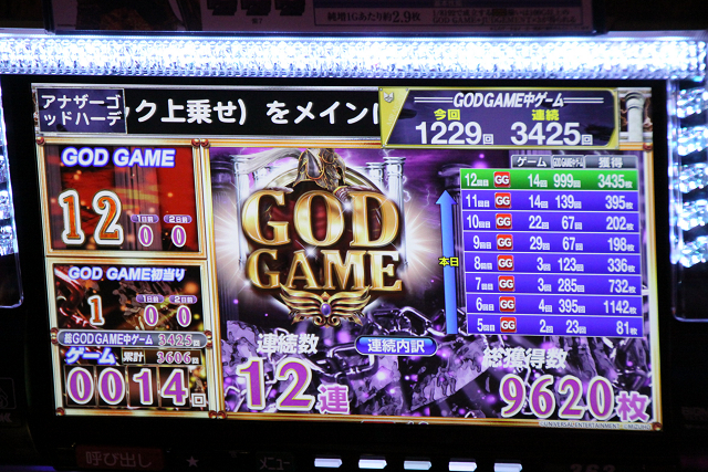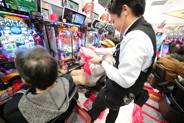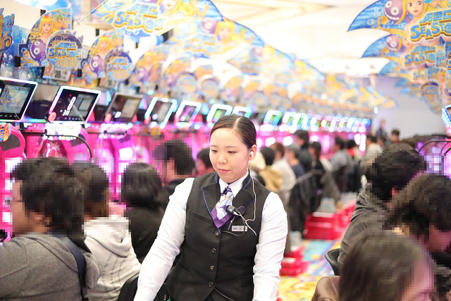 そして、遊技開始からあっという間に、あっちこっちそっちでリーチ、大当たりと遊技機の演出が目白押し!どの島も上へ下への大騒ぎ