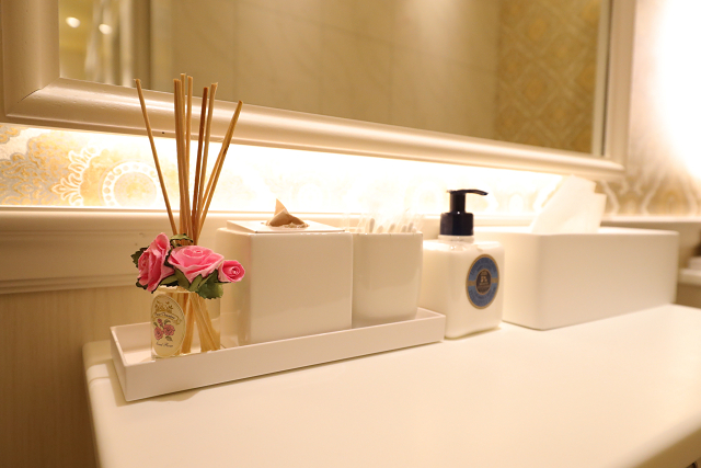 そこには豪奢な鏡台が鎮座し、リードディフューザーに綿棒、ティシューや脂取り紙などお化粧直しに、そしてエイジングケアにと、お気軽お手軽にグルーミングも可能なアメニティグッズの数々が用意されている!
