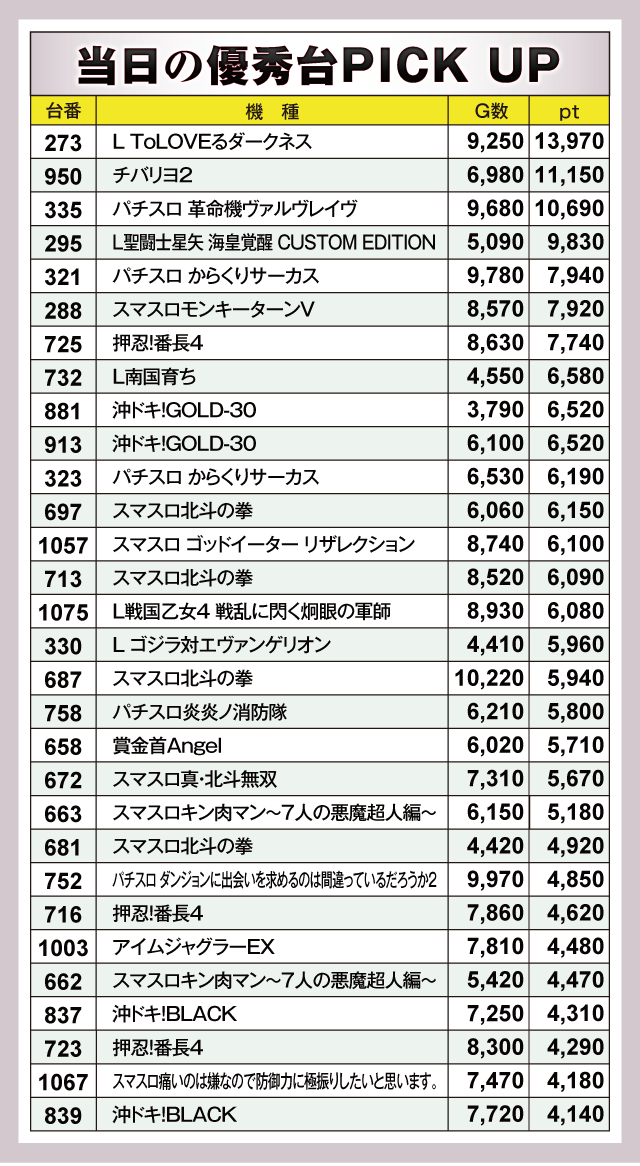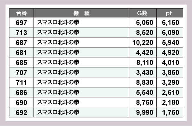 『スマスロ北斗の拳』は高い稼働率を誇るほか、上位10台が全て4桁pt超えと大活躍で多くのファンを楽しませていた。