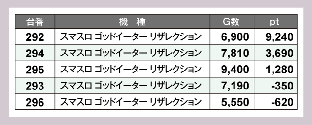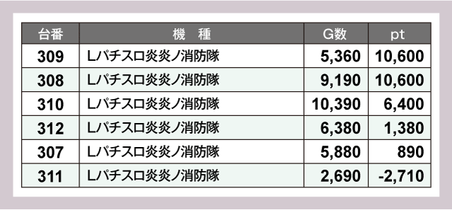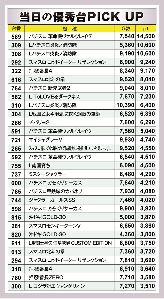 この日は589番台『パチスロ 革命機ヴァルヴレイヴ』の+14,500ptをはじめ、『Lパチスロ炎炎ノ消防隊』からは、なんと309番台、308番台の2台が万枚オーバーを達成していた!