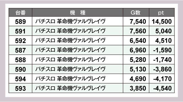『パチスロ 革命機ヴァルヴレイヴ』は差枚数1位となった589番台の14,500ptをはじめ、591番台+5,040pt、592番台+4,510ptとこちらも絶好調だ。