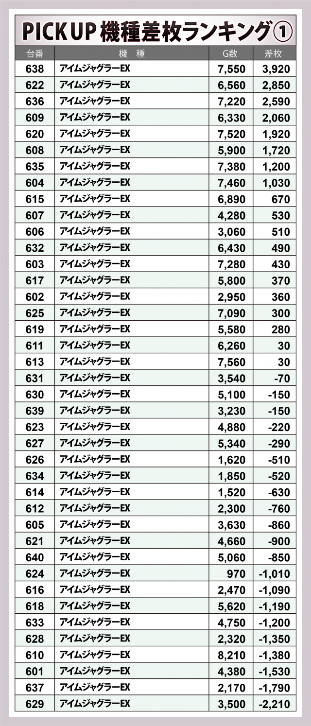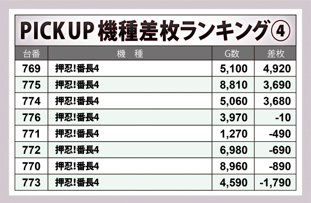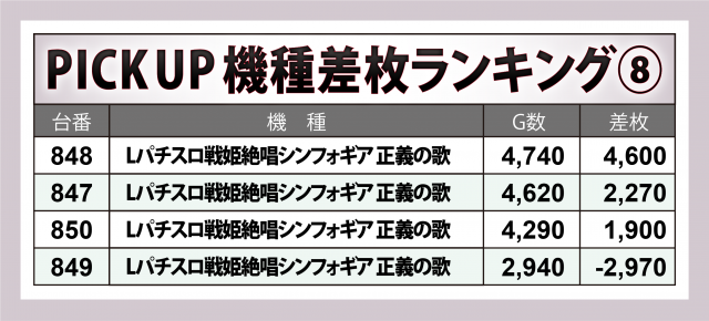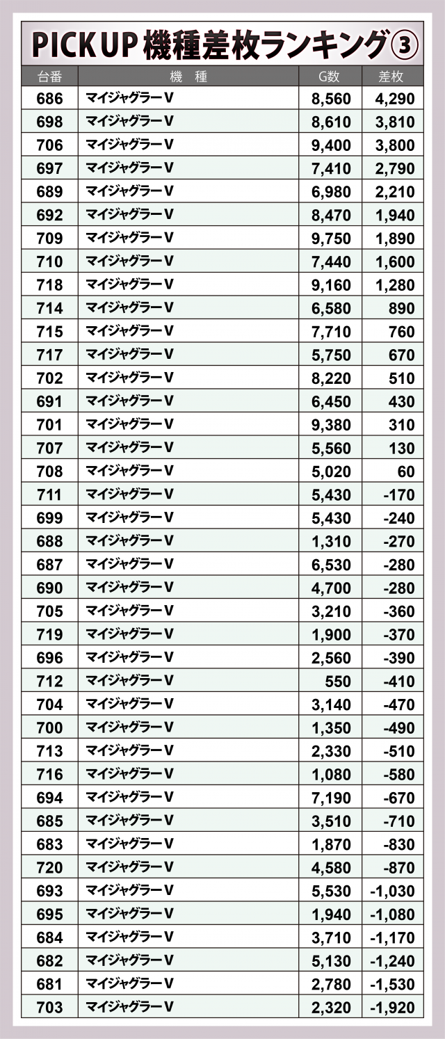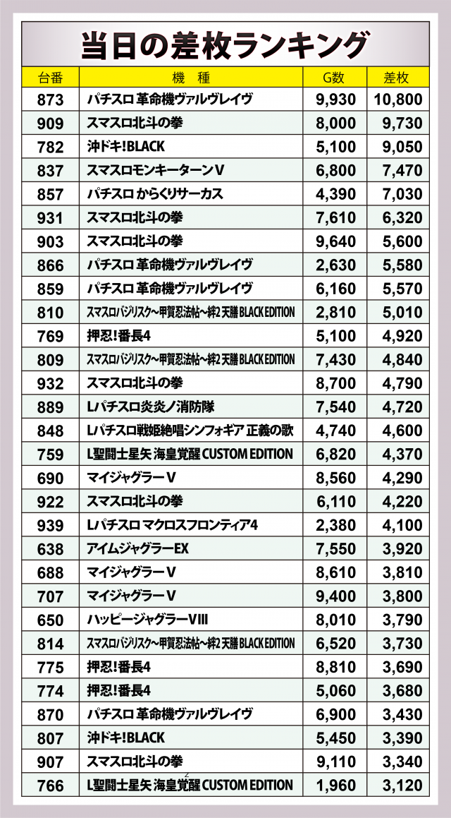 まずはトップ30台の数値から見ていこう。前回に続き30台の全てが+3,000枚以上を達成する高水準のキープに成功。さらに+4,000枚以上は19台、+5,000枚以上は10台、+6,000枚オーバーは6台、+7,000枚オーバーは5台、+9,000枚オーバーは3台、そして万枚をクリアしたのは1台と、今回もプラス5桁の輩出を成し遂げた。
