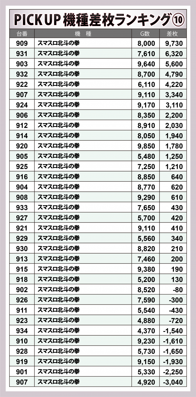 また『スマスロ北斗の拳』では他機種以上に高いプラス台割合が光り、+9,700枚超&&+6,300枚超&+5,600枚超が1台ずつ&+4,000枚オーバーが2台とビッグな出玉が続出。