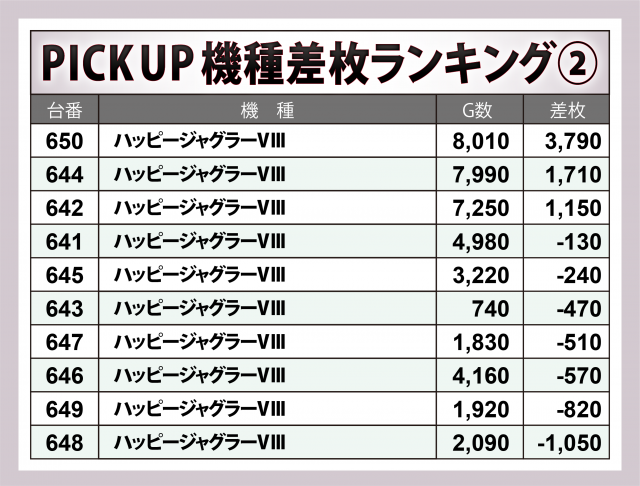 ジャグラーシリーズが高い安定度となった点も見逃せない。『アイムジャグラーEX』『ハッピージャグラーVⅢ』『マイジャグラーⅤ』それぞれに+4,000枚近い台をカウントすることができた。