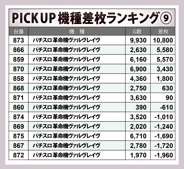 この中でナンバーワンに輝いたのが『パチスロ 革命機ヴァルヴレイヴ』873番台で、+11,000枚弱に達し、さらに同シマでは+5,000枚オーバーが2台と盛況。
