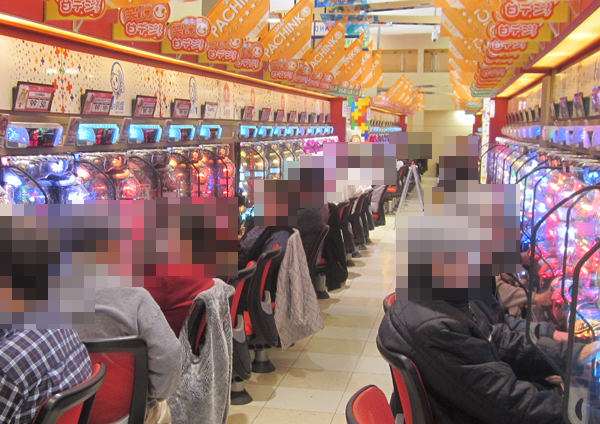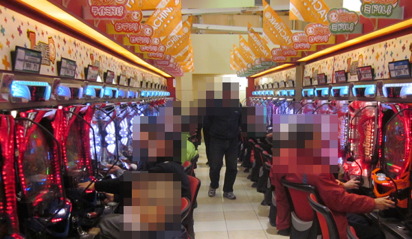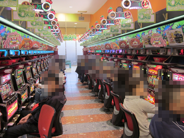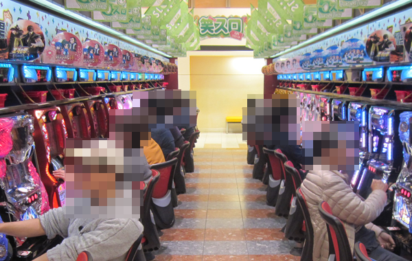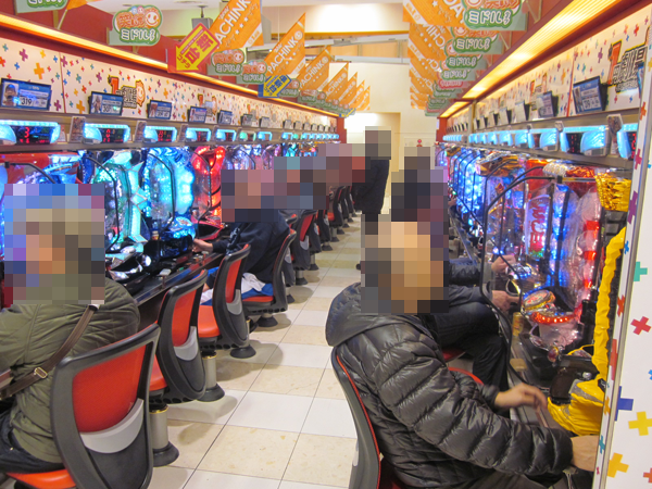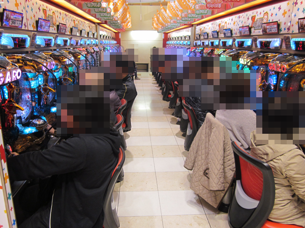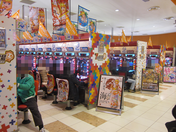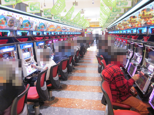 豊富な機種ラインナップとなっている海物語シリーズが大盛況。笑みを浮かべているプレイヤーも多い。
