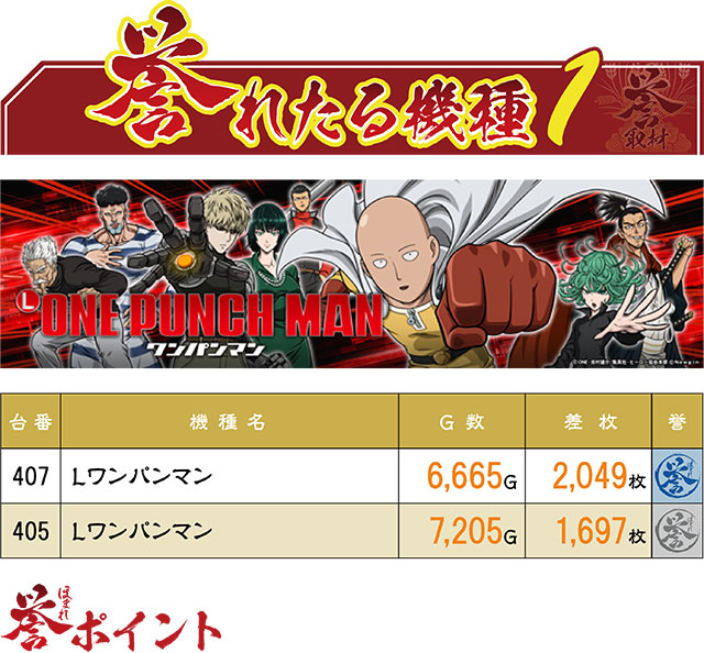 3台設置の『Lワンパンマン』は全台がプラス差枚を実現。3台のプラス台のうち、2台が誉マーキングという好環境だった。残念ながら赤誉マーク(=3,000枚以上)はなかったが、機種単位でチャンスが潜んでいたのは間違いないだろう。
