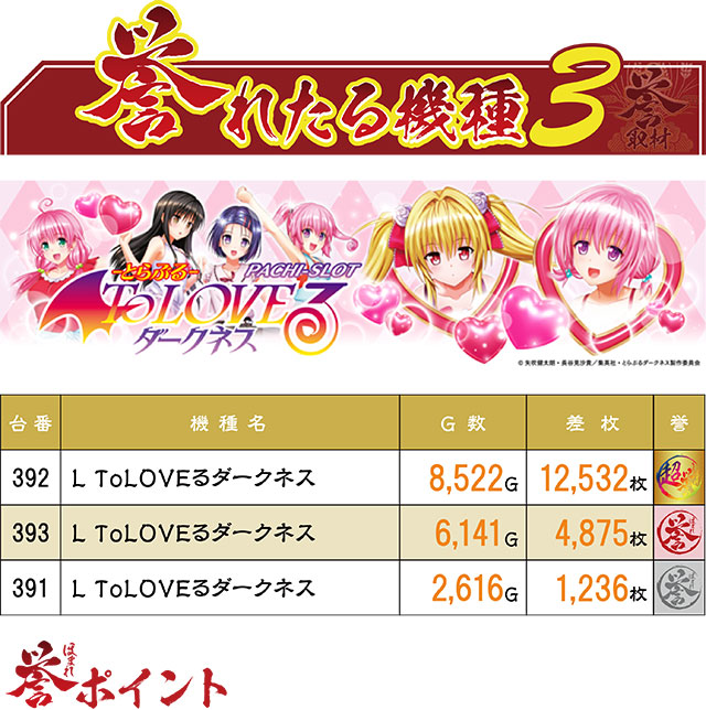 同じく6台設置で、これまた同じく半数の3台がプラスだった『L ToLOVEるダークネス』。こちらはプラスの3台すべてが誉マークとなっており、特に392番台は12,000枚を上回る大活躍を見せてくれた!
