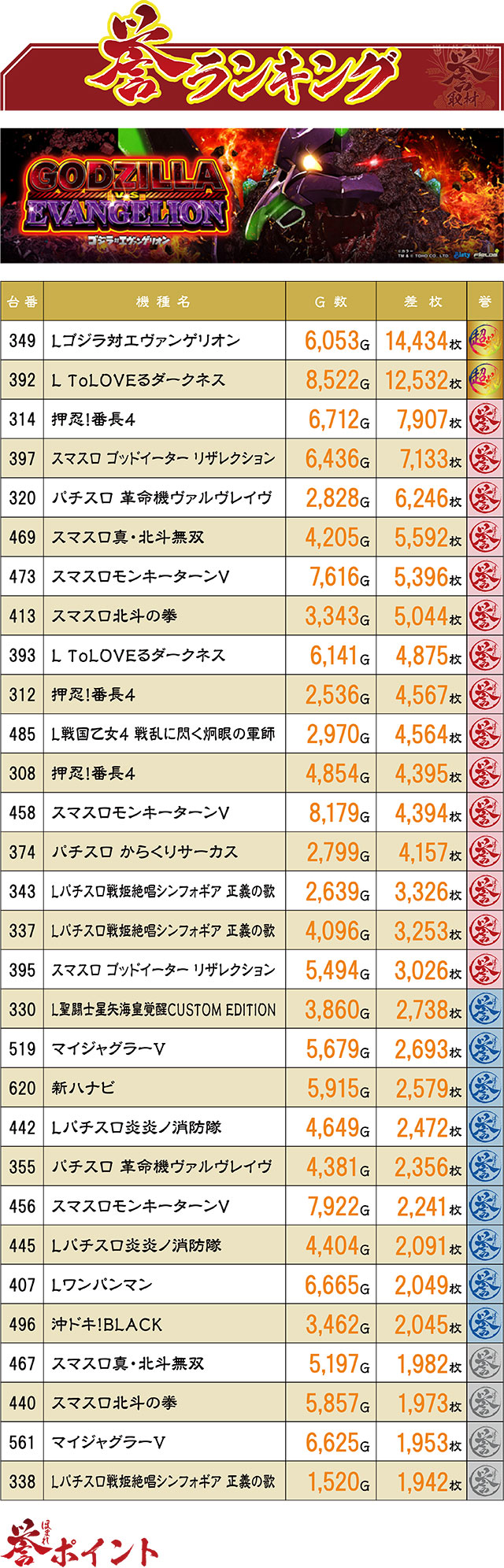 この日、12,000枚オーバー台が2台誕生!14,000枚超えを果たした『Lゴジラ対エヴァンゲリオン』がこの日の最高差枚レコードとなった。前回はTOP30にランクインしたなかった同機がまさかの首位記録。前回活躍を見せなかった機種がしっかり挽回しているあたりはさすが!