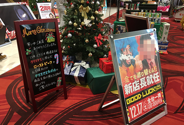 遊技台の上部に施された装飾やクリスマスツリー、手書きの看板など、みためにも楽しめるポイントが数多く存在している「ベラジオ横堤店」。
