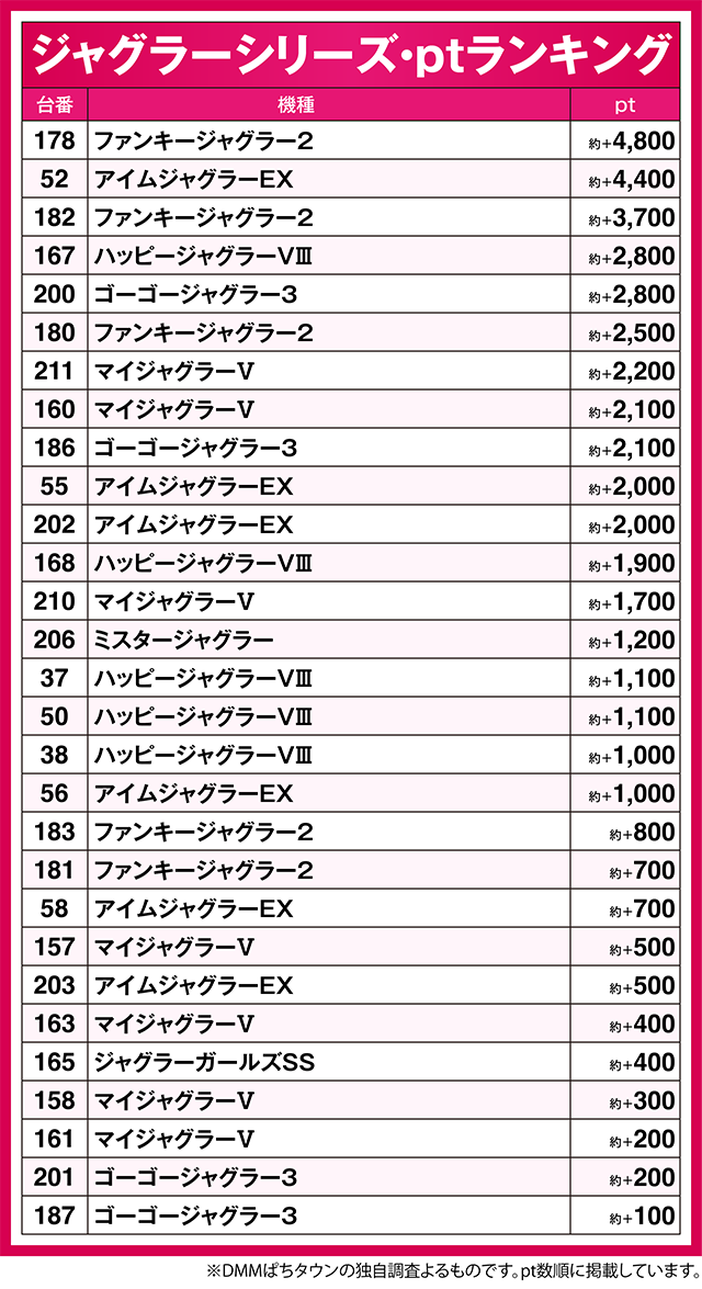 「アイムジャグラーEX」は、6台がプラスで、52番台は約+4,400pt!