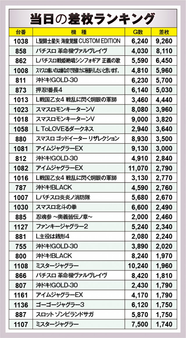 『L聖闘士星矢 海皇覚醒 CUSTOM EDITION』から9,000枚OVERという熱気が放たれ、さらには『パチスロ 革命機ヴァルヴレイヴ』にて8,000枚OVERが発生。店内各所で凄まじい熱量を確認でき、ファンは自然とレバーに力が入ったはずだ。さらに『アイムジャグラーEX』『ミスタージャグラー』で万回転OVER、ほかにも終日を通して打ち込まれた台が見られ、活気にも見ていたのが鮮烈であるばかりだ。