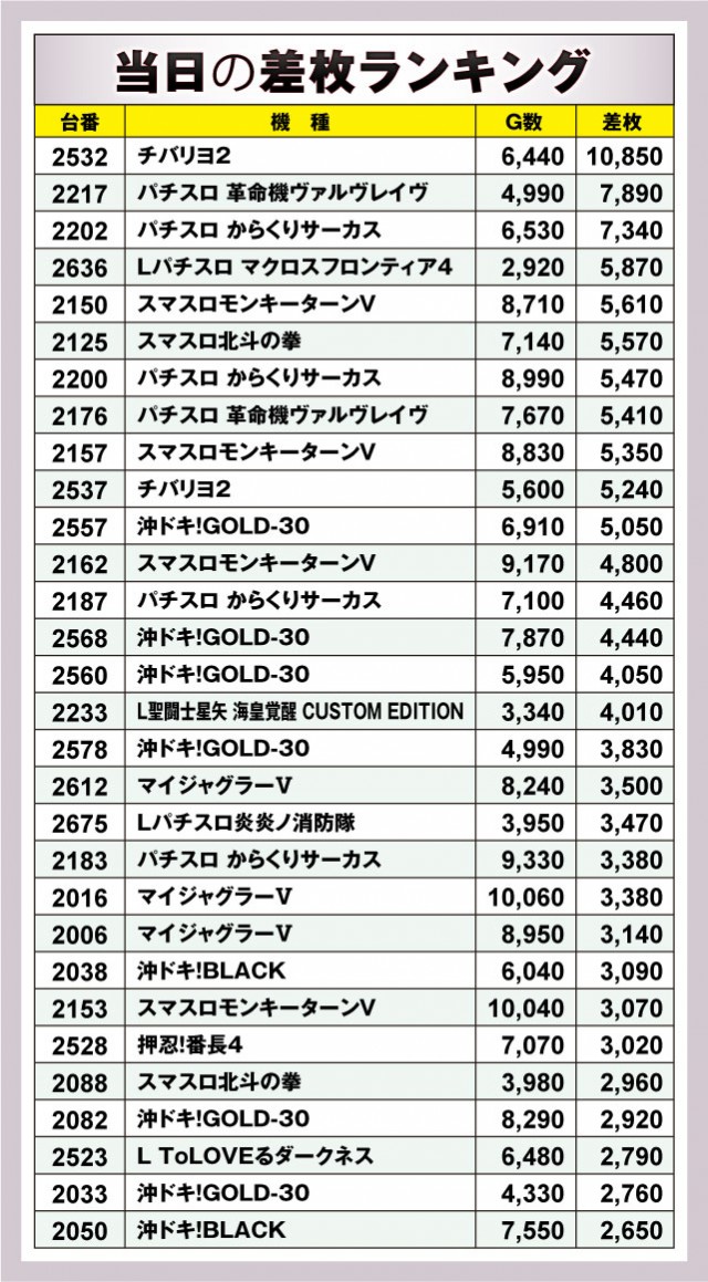 8月29日の差枚数ランキングはコチラ。トップは『チバリヨ2』の2532番台。前回なかった万枚オーバーが炸裂している。