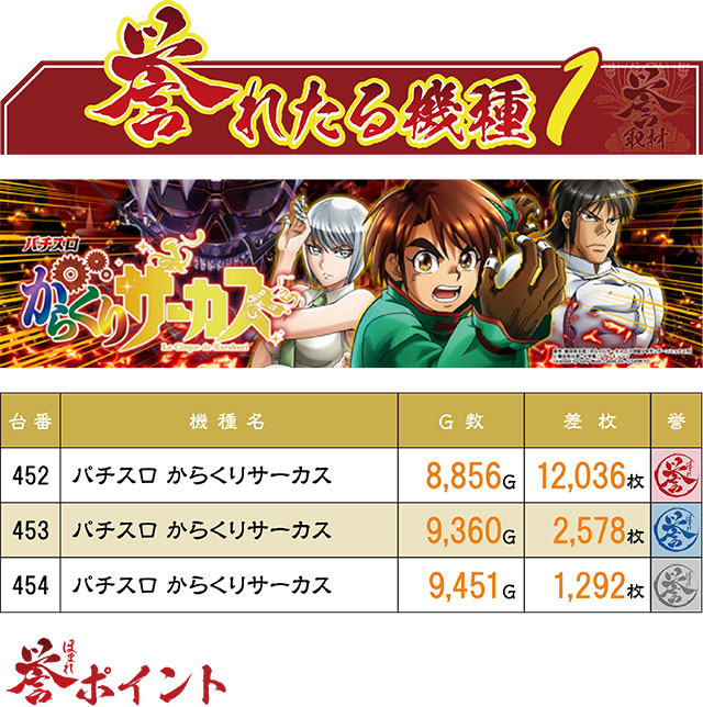 452番台が優秀台まっしぐらの挙動で、+12,000枚オーバーを達成!文句なしの結果に打っていた方も大満足だったことだろう。また、453番台も奮闘し、+2,500枚超えを実現した。