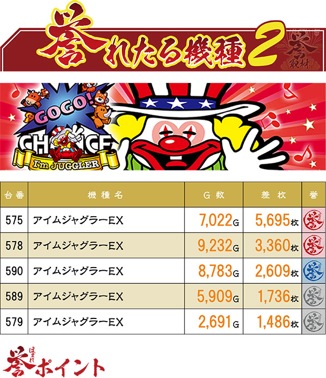まさか『アイムジャグラーEX』から+5,500枚オーバー記録が生まれるなど、誰が予想しただろうか。それほどの偉業をやってのけたのが575番台。さらに578番台も+3,000枚超えの健闘!