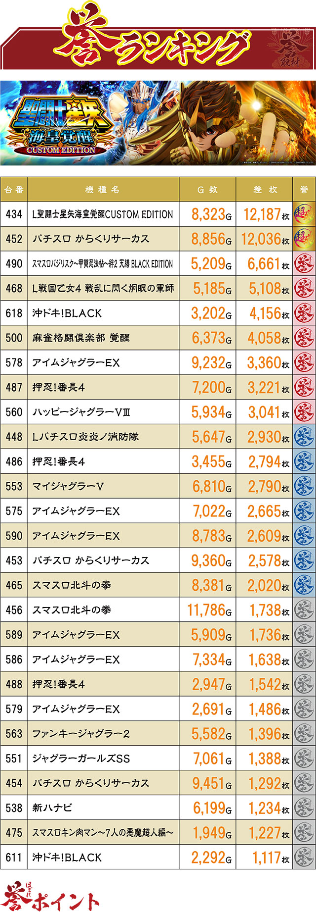 +12,000枚オーバーが2台も出現したこの日。僅差でTOPレコードとなったのは『L聖闘士星矢海皇覚醒CUSTOM EDITION』となった。また全体を通してランキングを見ると、『沖ドキ!BLACK』や『ジャグラー』シリーズが多くランクイン!