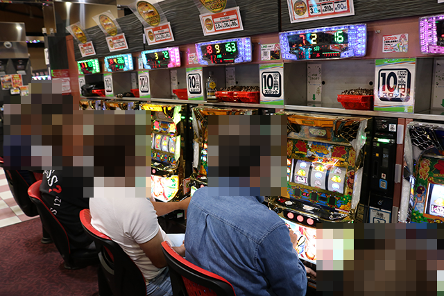 「沖ドキ!GOLD」も空き台はなく、2箱以上や1箱以上の持ち玉で遊技をおこなう姿があった。