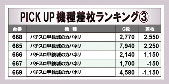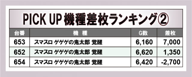 優秀機種として取り上げた機種では、上位差枚をマークした『Lパチスロ炎炎ノ消防隊』『スマスロ ゲゲゲの鬼太郎 覚醒』『スマスロ北斗の拳』のほかに、6.5号機不動の人気機種『パチスロ甲鉄城のカバネリ』も好調ぶりをみせていた。