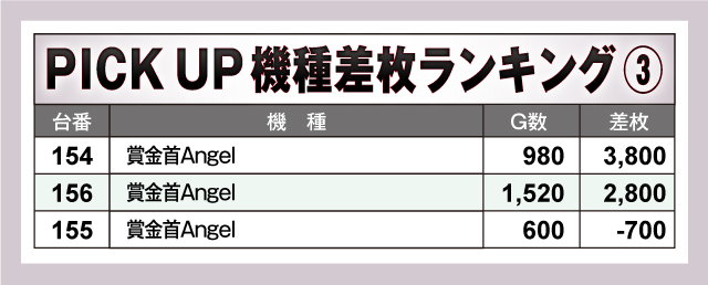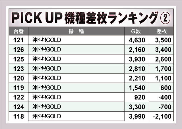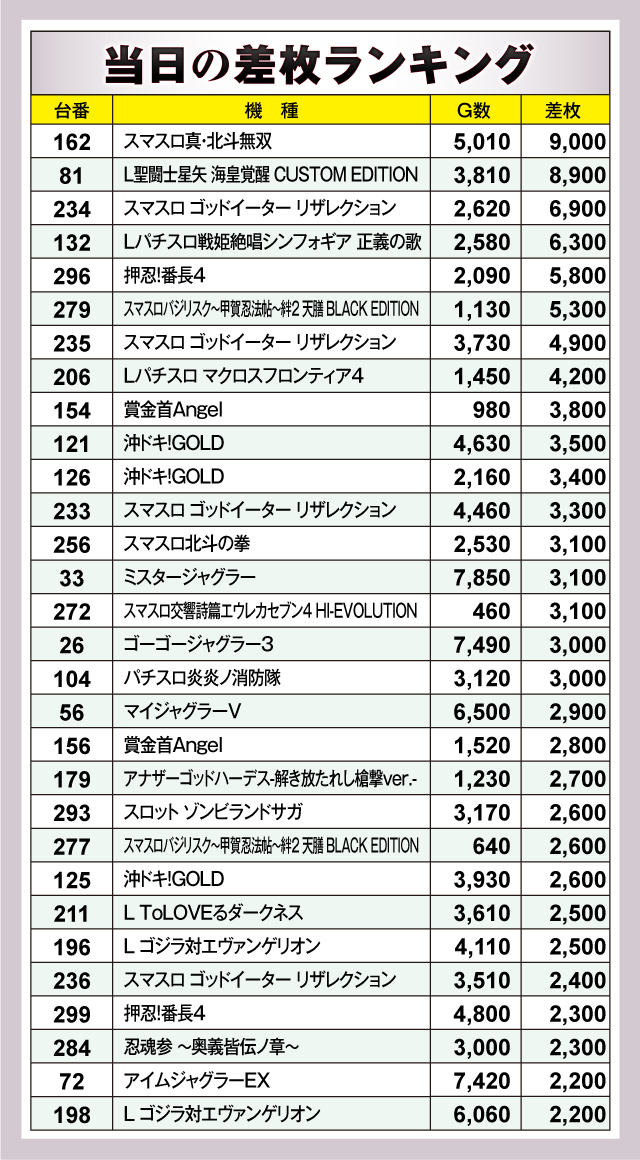 まずは差枚ランキングのチェックから。30台すべてが+2,000枚オーバーで、+3,000枚オーバーは17台出現。それらのなかでもっとも優秀だったのは、162番台の「スマスロ真・北斗無双」で、差枚は+9,000枚を獲得! その他ランクイン機種を見渡すと、スマスロ人気機種を中心に幅広い機種がランクイン! 店内のいたるところにチャンスが隠されていたようだ!