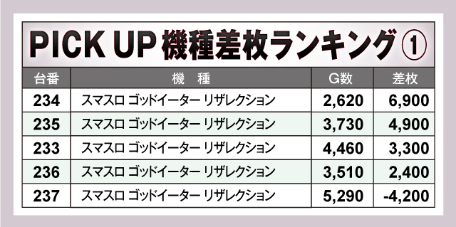 続いては、当日とくに盛り上がっていた3機種を紹介。3機種すべてがトータルプラス終了しており、それらのなかでもっとも優秀だったのは、ピックアップ5台のうち4台がプラスだった「スマスロ ゴッドイーター リザレクション」。5台並びで好記録が出現しており、3/5台が+3,000枚を超える素晴らしい結果を残していた! またその他2機種からも良台を多数確認できたので、チャンスは至る所に隠されていたようだ!