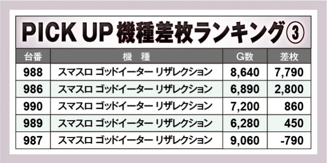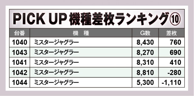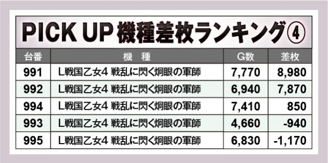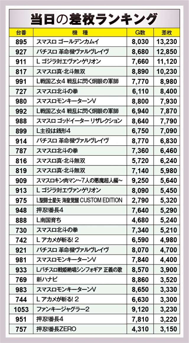 数多くの機種が設置されている店内だが、上表の10機種は特に注目度が高いエリアだったと言える。『押忍!番長4』『スマスロモンキーターンV』『スマスロ ゴッドイーター リザレクション』『L戦国乙女4 戦乱に閃く炯眼の軍師』から凄まじい熱気が放たれ、大台突破台が生まれたことによって、ファンはレバーを力強く叩いていたことだろう。