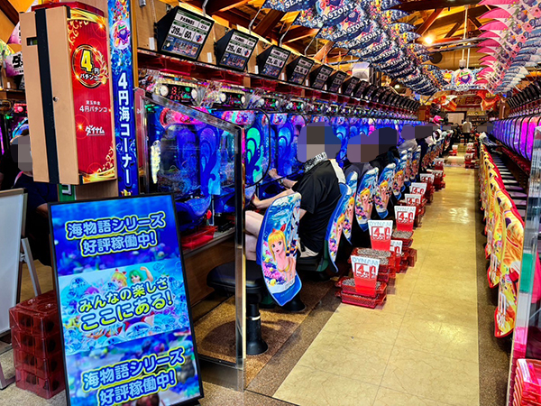 15時ごろの4円パチンコでは、「P大海物語5」や「Pフィーバー機動戦士ガンダムユニコーン 再来-白き一角獣と黒き獅子-」、「ぱちんこ シン・エヴァンゲリオン Type レイ」などでプレイヤーが華麗なパフォーマンスを披露。微笑ましいシーンを随所で目にしている。