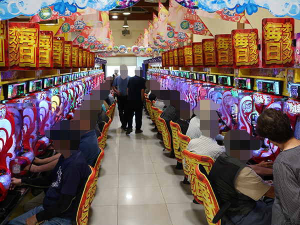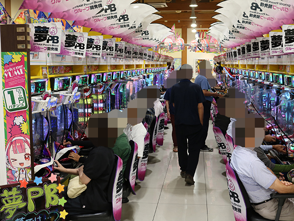 1円パチンコに目を移すと「PAコマコマ倶楽部 with 坂本冬美 ごらくバージョン」などのプライベートブランド機や、「PA大海物語5 Withアグネス・ラム」といった海物語シリーズに人気が集まっており、ほぼ満席となるほどのにぎわいを見せていた。