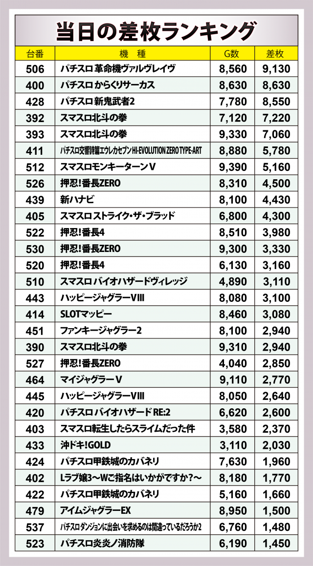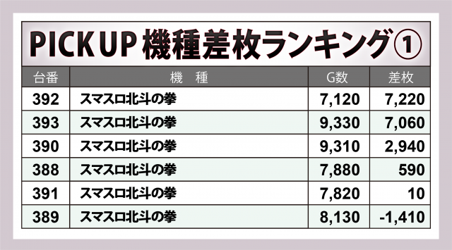 中でも『スマスロ北斗の拳』では、+7,200枚超&+7,100枚弱&+2,900枚超が1台ずつと、前項で挙げた機種にも負けない盛況を誇った。
