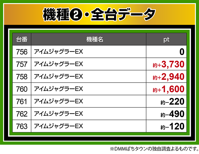 『アイムジャグラーEX』では、757番台から760番台までが並んで約+1,600pt以上!!