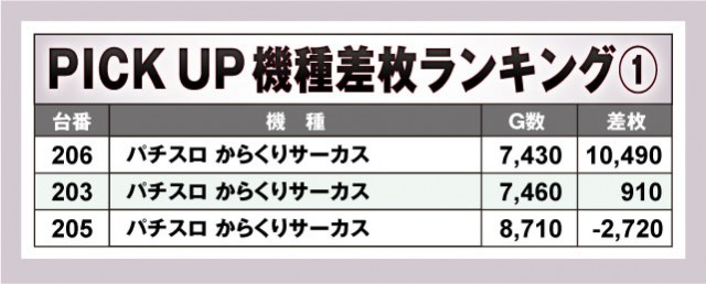 さて、ピックアップ機種もご覧いただこう。今回はお見事万枚が飛び出した『パチスロ からくりサーカス』なのだが、206番台以外の結果は上表の通り。いずれもガッツリ稼働している。そこから導き出せる答えはなんなのだろうか。