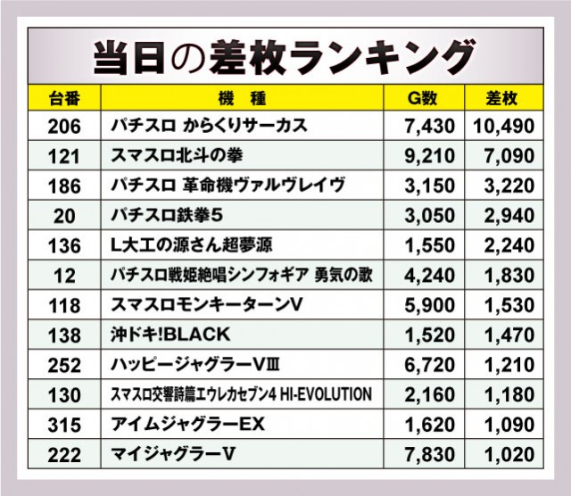 今回の優秀台は上表の通り。まずは一番上に記載されてある機種からだが、なんと『パチスロ からくりサーカス』の206番台から大台に乗る10,490枚の差枚が飛び出した。
