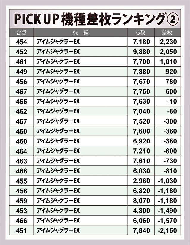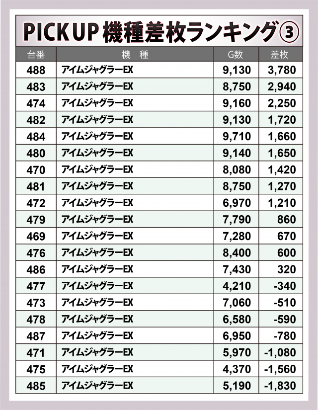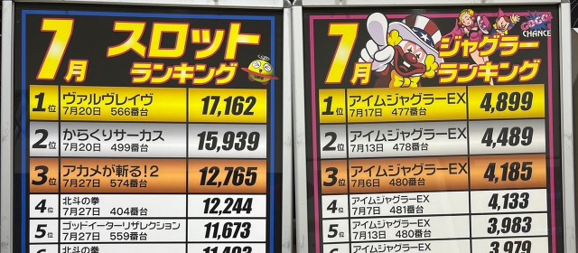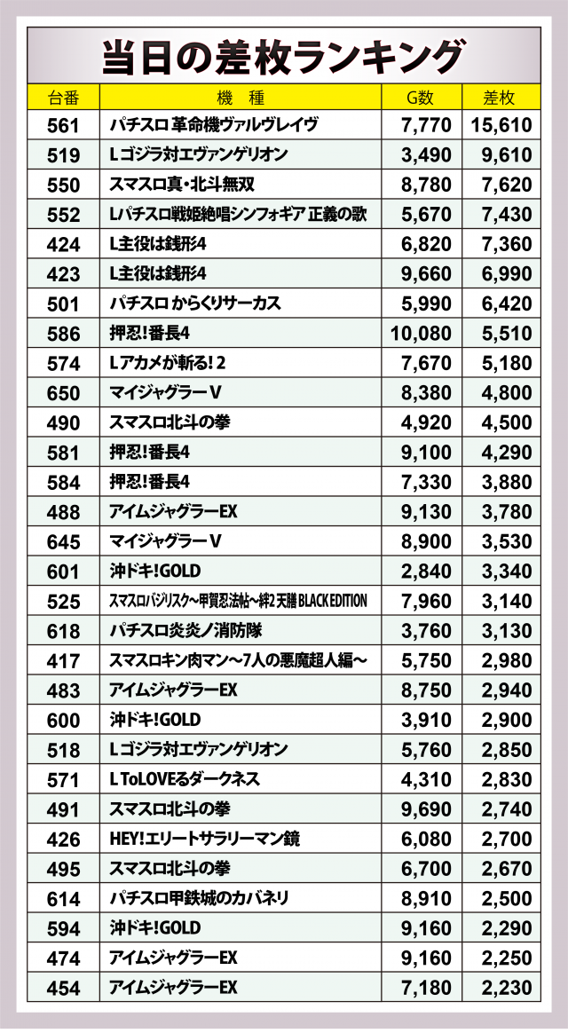 まずは優秀30台をチェック。同店では恒例だが30台の全てが+2,000枚以上を成し遂げ、+3,000枚以上は全体の6割となる18台、+4,000枚以上は12台、+5,000枚オーバーは9台、+6,000枚オーバーは7台、+7,000枚オーバーは5台、+9,000枚オーバーは2台、そして万枚突破は1台と、相変わらずの高水準をキープした。