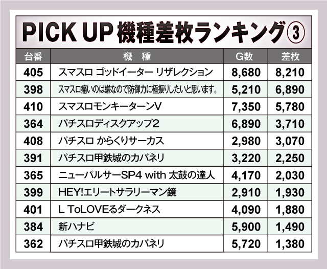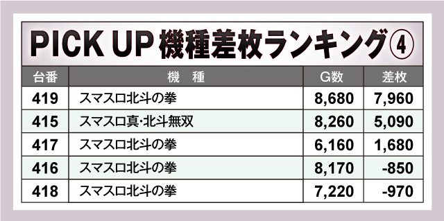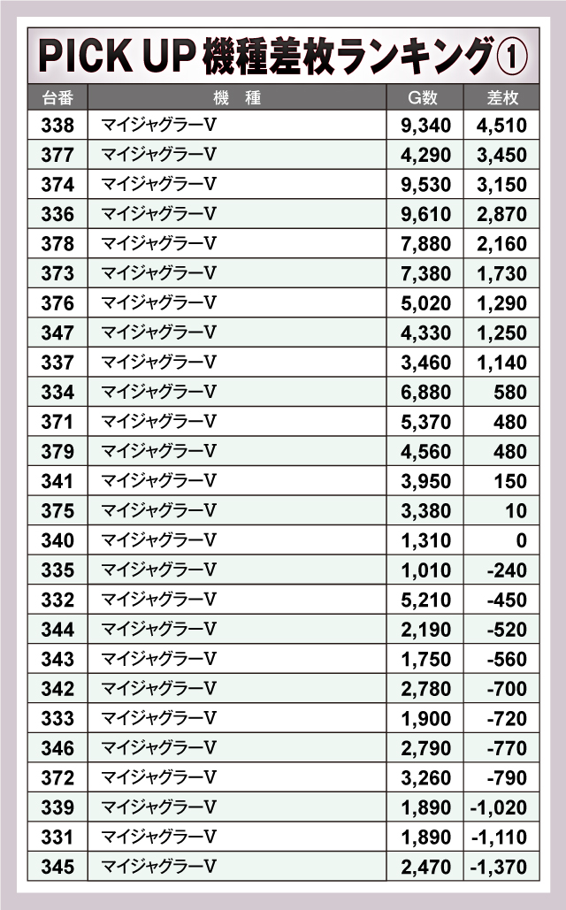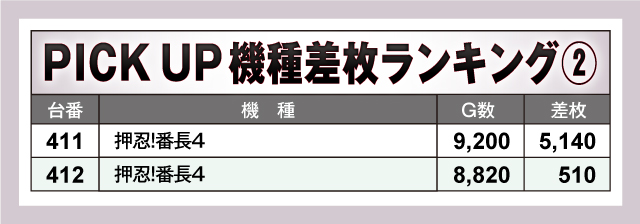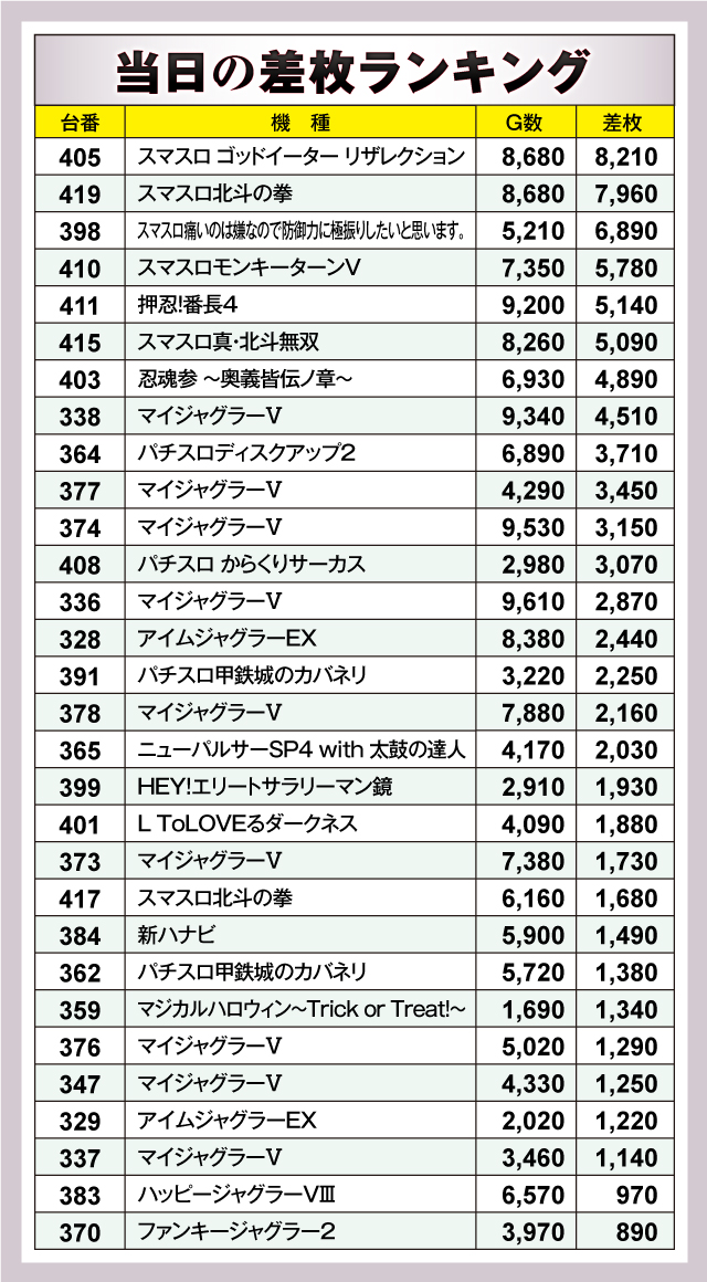 機種別に見ていくと、定番の『マイジャグラーV』の半数以上がプラス差枚の大活躍で際立つ存在感を放っていた。また、『押忍!番長4』や『スマスロ北斗の拳』といった人気機種はもちろん、バラエティコーナーに至るまで大きな熱量を放っており、ホール内の様々なコーナーにチャンスが潜んでいたことが確認できた。