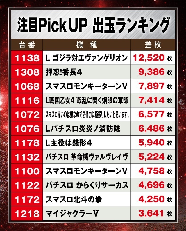 この日は、万枚超を叩き出し出玉ランキング1に輝いた『L ゴジラ対エヴァンゲリオン』や万枚超目前に迫った『押忍!番長4』を筆頭に定番人気のスマスロが大盛り上がりであった。