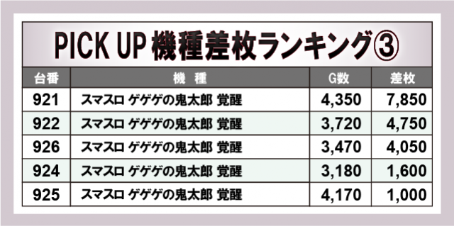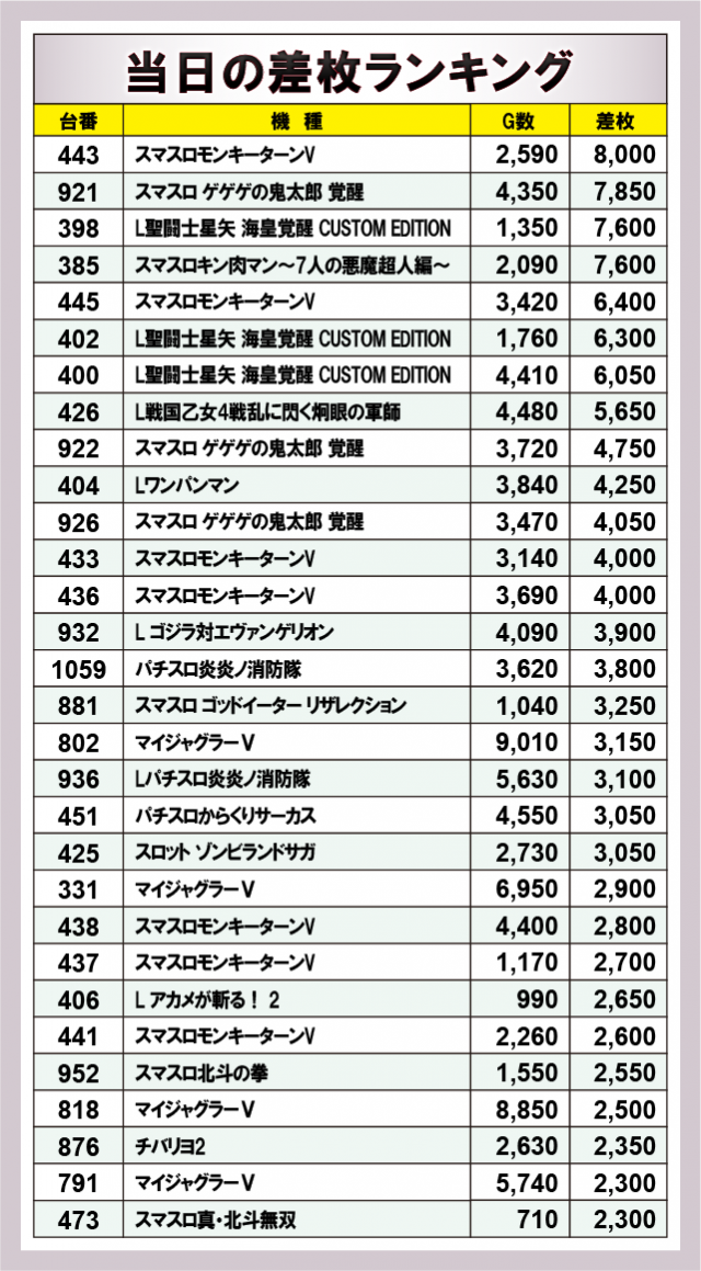 上表の3機種はしっかりとポテンシャルを解放していた様子で、まとまった出玉を獲得したファンは口角を緩めながらレバーを叩いていたはずだ。なかでも『スマスロモンキーターンV』は、この日のトップ差枚数+8,000枚を筆頭に+2,000枚OVER台が多数存在し、しっかりとポテンシャルを解放していた様子が窺える。
