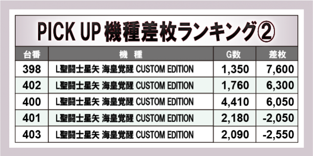 差枚ランキングをチェックすると、大台となる+5,000枚overを達成した台が8台も出現。トップ差枚数を獲得したのは『スマスロモンキーターンV』で+8,000枚を獲得。他にも『スマスロ ゲゲゲの鬼太郎 覚醒』『L聖闘士星矢 海皇覚醒 CUSTOM EDITION』『スマスロキン肉マン~7人の悪魔超人編~』が+7,000枚overと、ホール内でも特に目立つ挙動を見せていた。