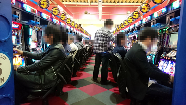 充実した機種ラインナップの5円パチスロも人気。こちらも空台を探すのが大変なほどの盛り上がりを見せていた。