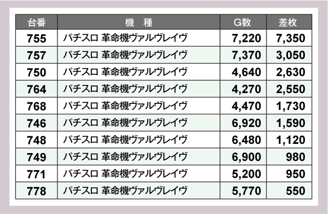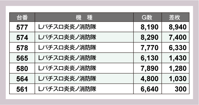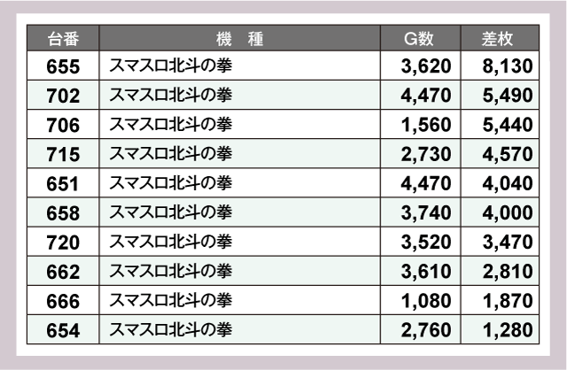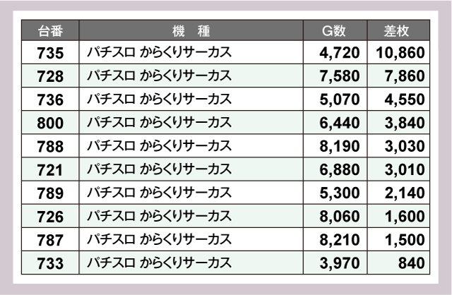 圧巻だったのは『パチスロ からくりサーカス』の735番台。+10,860枚という衝撃の差枚を叩きだしていた。次いで『Lパチスロ炎炎ノ消防隊』577番台が+8,940枚、『スマスロ北斗の拳』655番台が+8,130枚と、いずれもうらやましい結果を残している。