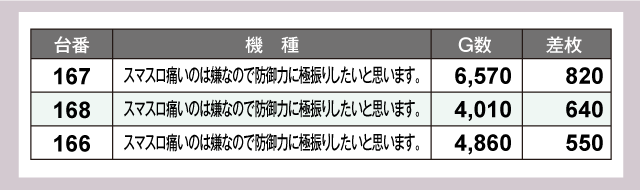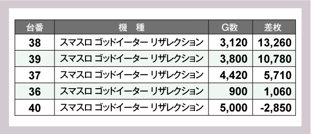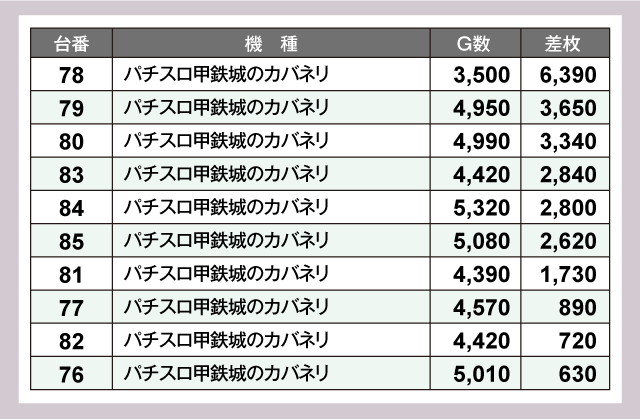 特に目立っていたのが『スマスロ ゴッドイーター リザレクション』で全5台中4台がプラス差枚、しかもそのうちの2台が万枚超を記録する圧巻の結果を残している。また、『パチスロ甲鉄城のカバネリ』は全台がプラス差枚で、出玉ランキングナンバー1の78番台が+6,390枚を叩き出しているだけにファンも大満足だったようだ。