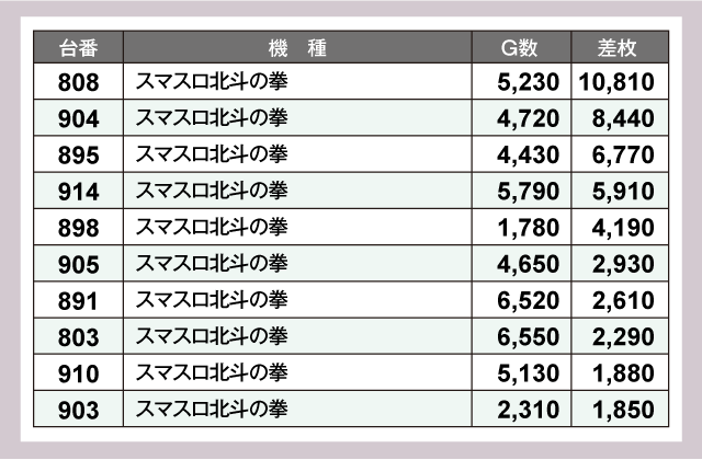 まずはパチスロの方をチェックしてみると『スマスロ北斗の拳』で+4,000枚超が5台、なかでも出玉ランキングナンバー1の808番台が万枚超の10,810枚を叩き出す見事な結果を残している。